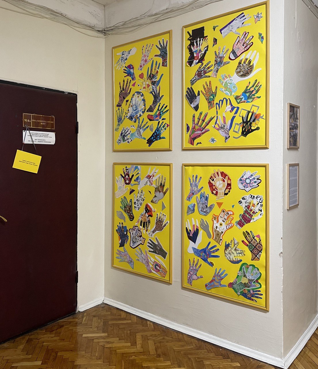 «Вікно долонь» – це виставка-інсталяція, на якій об’єднано роботи студентів першого курсу Факультету дизайну і реклами та відвідувачів соціально-психологічного центру, у яких вони створювали образні композиції на основі обведеної кисті власної руки. Проєкт запрошує до пошуків себе, до вдосконалення світу довкола себе, до творення нових змістів. Мистецький простір інсталяції не має меж. Кожен, хто хоче долучитися до проєкту, може відтворити свою долоню та додати її до тих, що вже є.