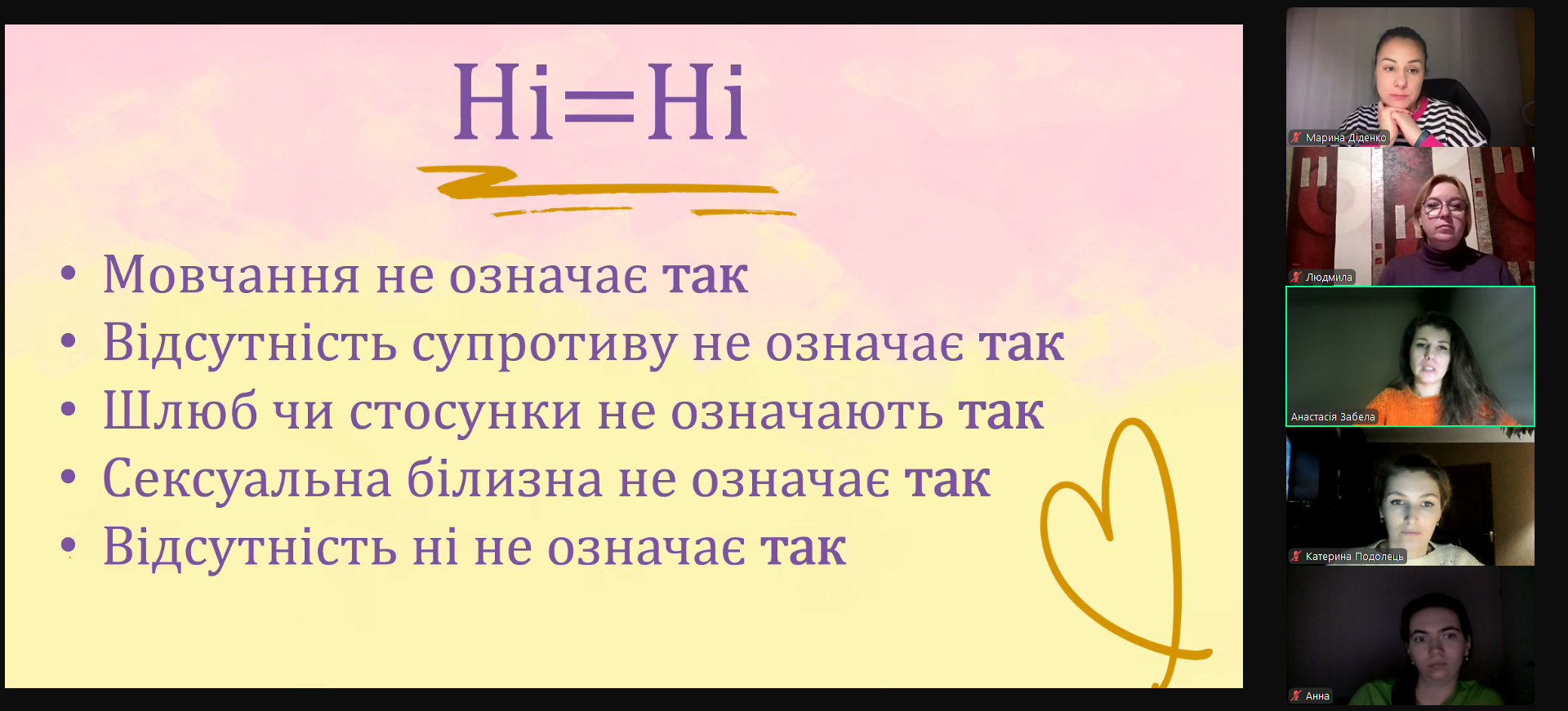 Організаторкою вебінару «Мода на згоду: що потрібно знати про згоду на секс і як це впливає на твоє ментальне здоров’я» виступила доцентка з/н кафедри філософії і педагогіки, консультантка соціально-психологічного центру КНУКіМ Марина Діденко. Захід відбувся у співпраці з ГО «Точка опори ЮА» та проєктом підтримки ментального здоров’я для молоді «Змі(ц)нюй». Спікеркою вебінару стала Анастасія Забела – психологиня, авторка блогу «У трусах» та книги «Про секс та інші запитання, які цікавлять підлітків».