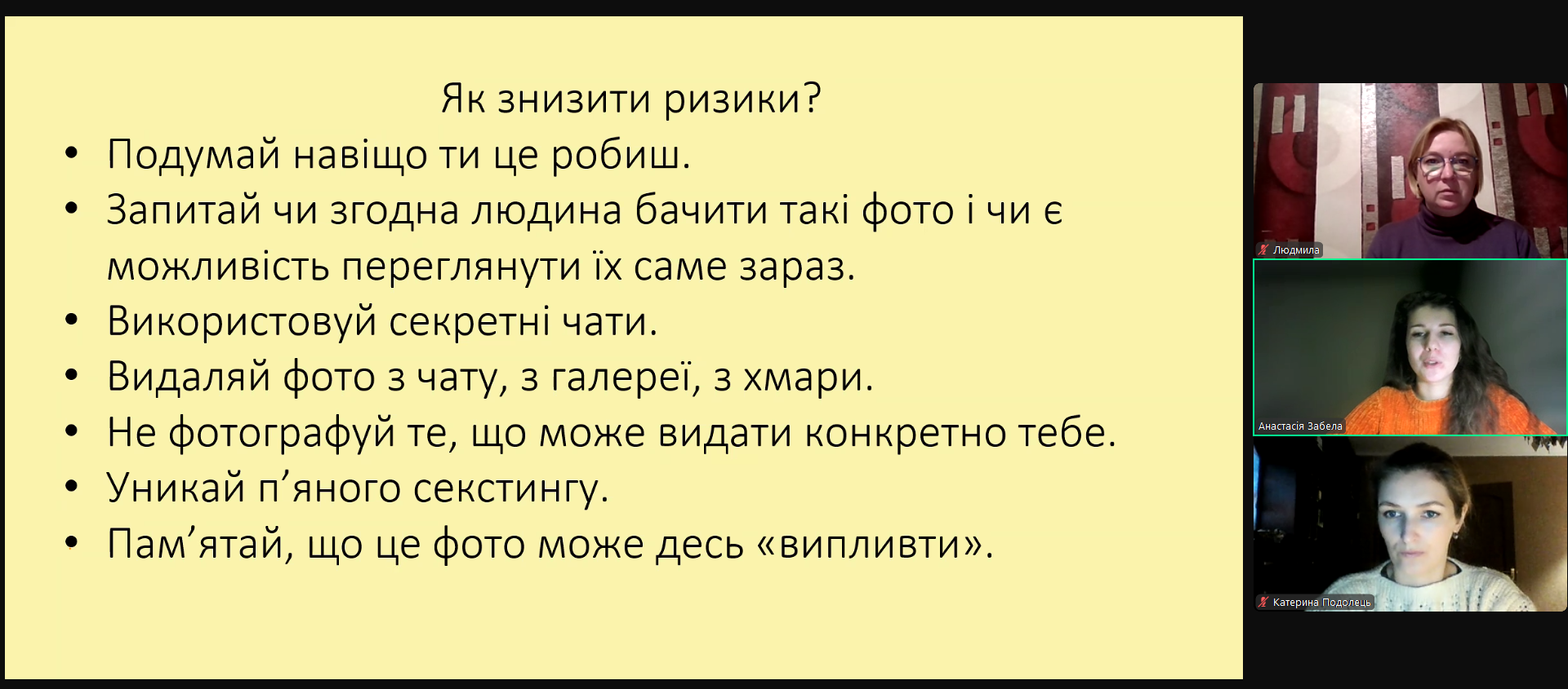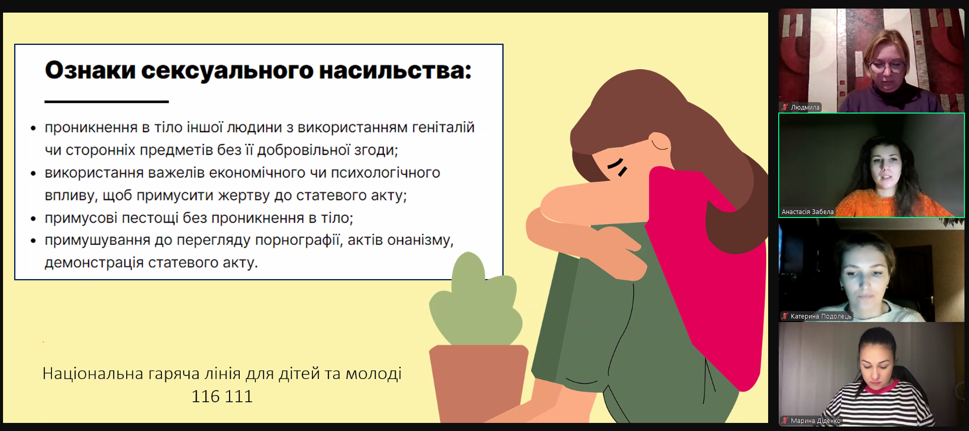 Окремо спікерка зупинилася на ознаках сексуального насильства та звернула увагу учасників на телефон Національної гарячої лінії для дітей та молоді, куди можна безкоштовно та в разі необхідності анонімно звернутися з питань попередження ґендерно зумовленого насильства та торгівлі людьми – 116 111.